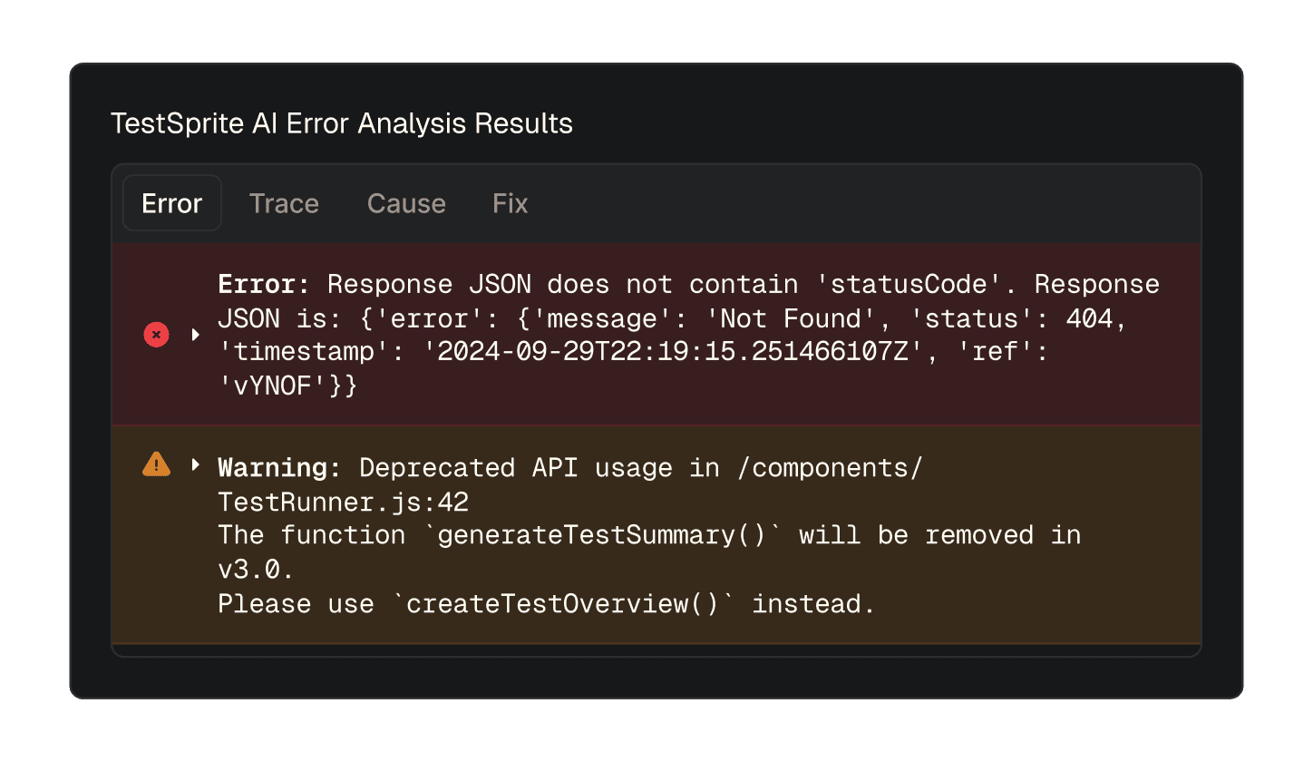 Once the test is run and completes, TestSprite provides a comprehensive set of results and reports, including error types, causes, and recommended fixes.