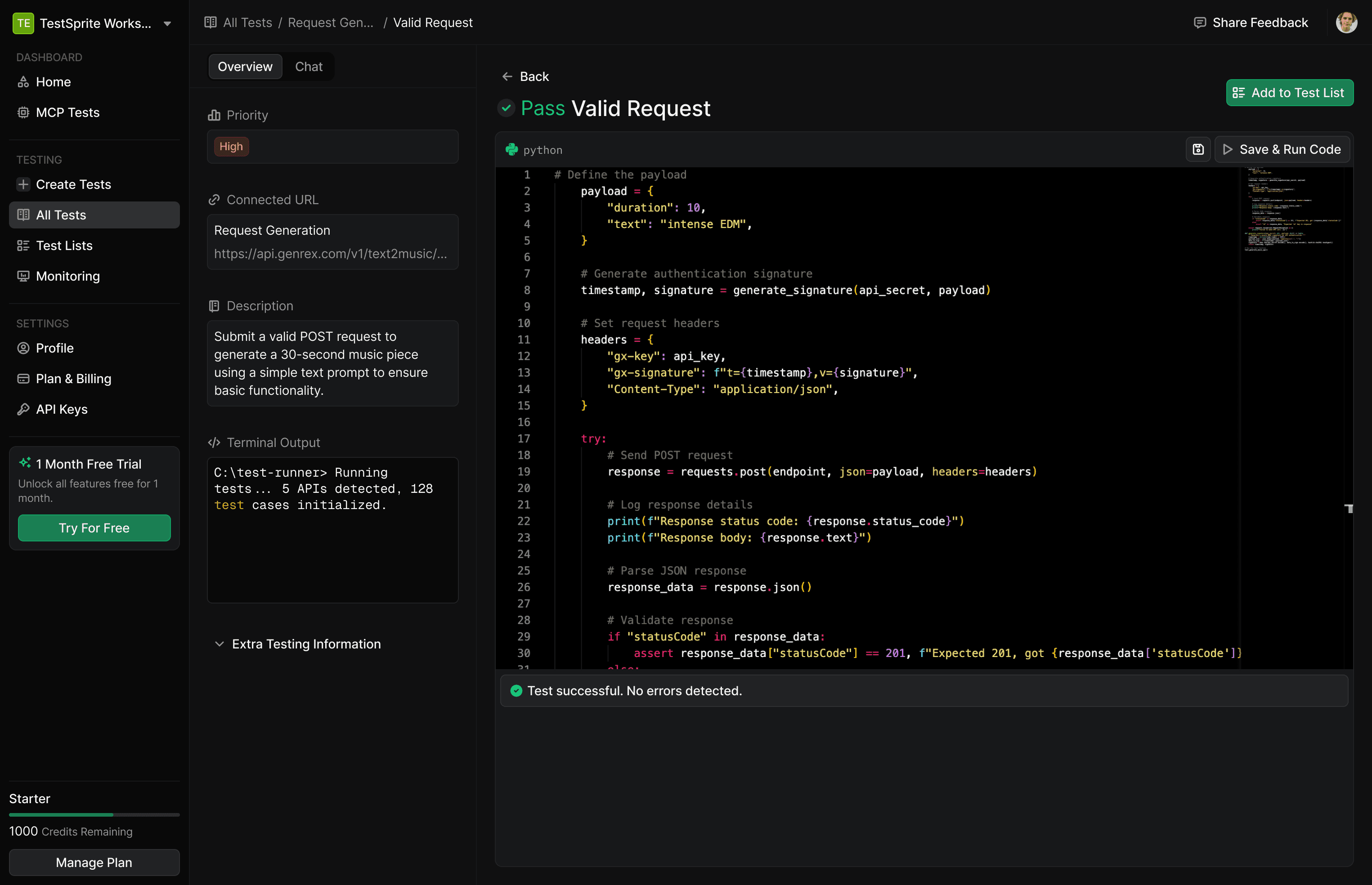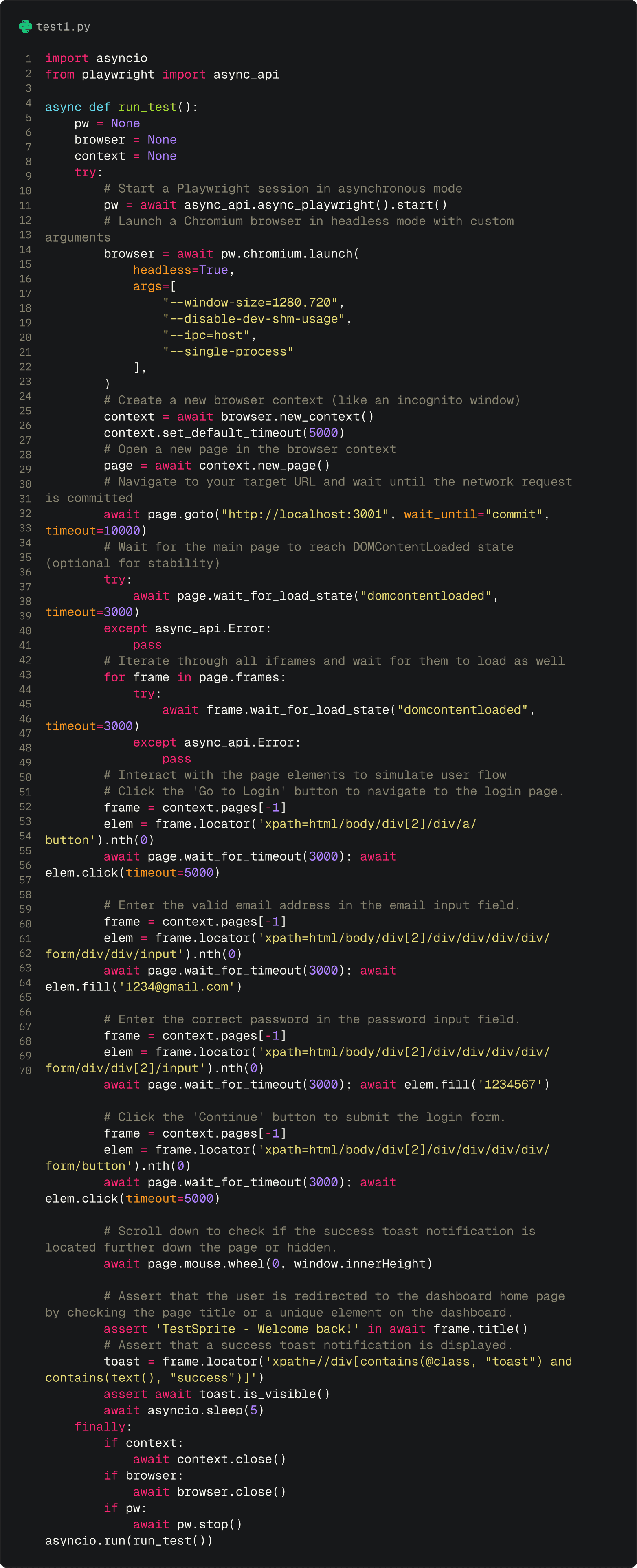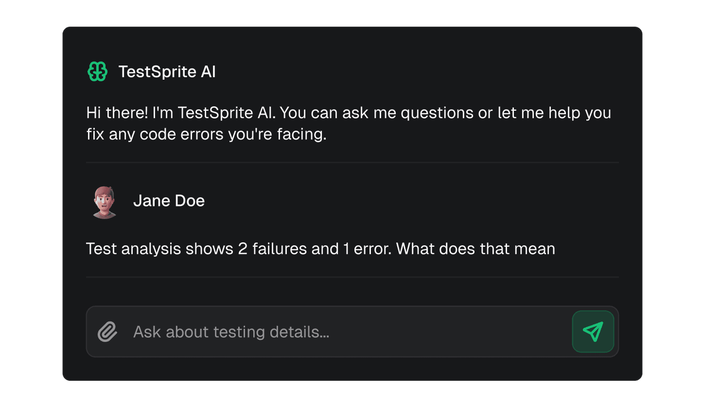 Provide feedback in natural language on what went wrong or what needs to be corrected, and TestSprite’s AI will adjust the testing code or answer any relevant questions, making revisions simple and intuitive.