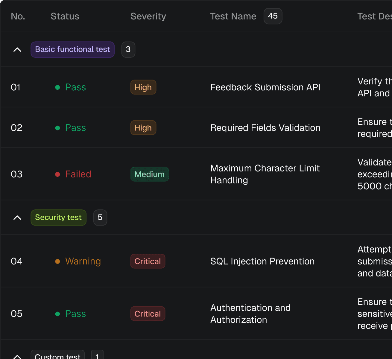 You can view the exact code that was executed during each test and review detailed reports, which highlight failures, potential issues, and root causes.